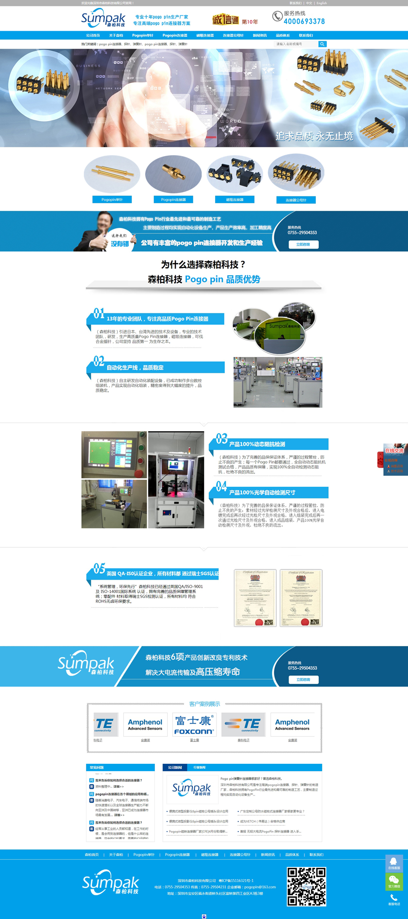 深圳市森柏科技有限公司是专注高端pogo pin连接器、探针、弹簧针的制造厂家,森柏科技拥有Pogo Pin行业最先进和最可靠的制造工艺,主要制造过程均实现自动化设备生产,产品生产效率高,加工精度高,重要检测过程均采用自动化快速识别系统,大大降低了人为操作失误的风险,极大的提升了检测效率,工艺过程得到极大的改善和满足。因此产品质量和稳定性获得巨大突破。